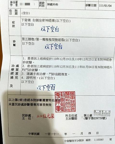 12/14閃到腰,以為隔天就不會痛了後來12/15掛急診,醫生也覺得我閃到腰就開肌肉鬆弛劑跟止痛藥給我,但是都沒改善12/25我又掛了一次急診,因為已經從右腰痛到右大腿,坐著躺著走路都痛,醫生直接幫我掛空軍醫院葉士豪醫生12/30葉士豪醫生初步檢查就覺得我脊椎有問題,並且有坐骨神經痛,照了X光,確定第五腰椎有問題,於是排了1/4核磁共振照完核磁共振之後發現第五腰椎\第一薦椎椎間盤破裂,建議我緊急開刀,我當時害怕極了